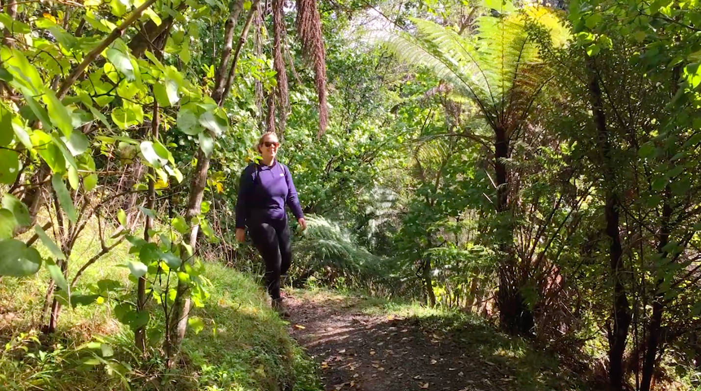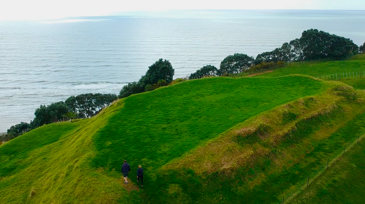 Vi fortsätter vandringen uppför kullen och snart är vi ute ur lövskogen. Istället gräs och ängar så långt ögat kan nå. Några hagar med får och kor här och där. Allra högst upp på toppen ligger en historisk plats med koppling till maorierna. En gång i tiden hade maorier sin befästning här, skyddad och med uppsikt över omgivningarna och eventuella fiender. Idag är det enda som återstår en upphöjning täckt av gräs.