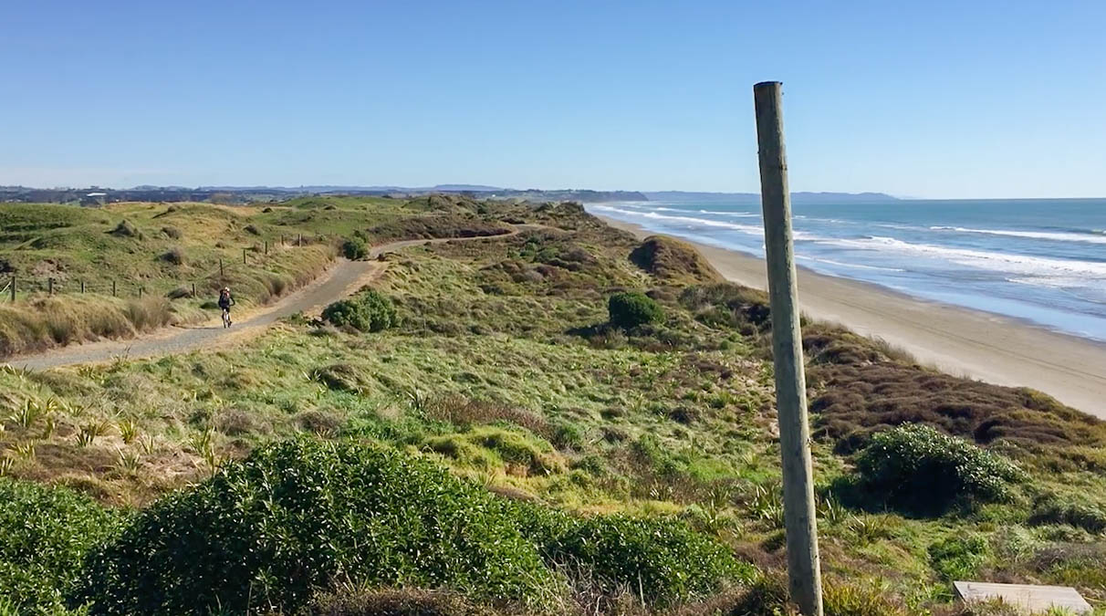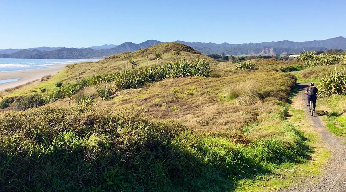 Den här mountainbike-leden heter ”Dune Trail” och går mellan sanddynerna utanför det lilla kustsamhället Opotiki. Leden är bred och relativt platt men ändå med sköna och enkla upp- och nerförsbackar. Inga svåra hinder eller stockar och stenar. Perfekt om en som vi vill cykla med fin utsikt, oavsett om det är full fart eller i lugn takt. Vi växlar mellan olika tempon och stannar ofta för att ta bilder.