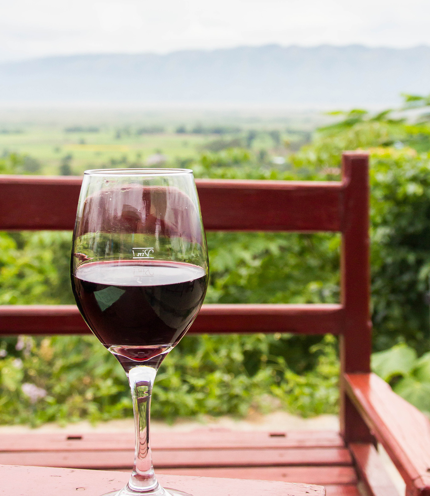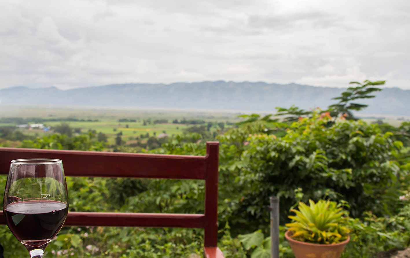 Vingården ligger väldigt nära Nyaung Shwe. Det är ingen skylt som visar var du ska svänga. Men om du spanar upp mot bergssidorna när du cyklar vägen fram ser du vinrankorna i prydliga rader på sluttningarna. Sväng in vid den stora infarten precis i närheten och 500 meter senare passerar du under en stor välkomstskylt.