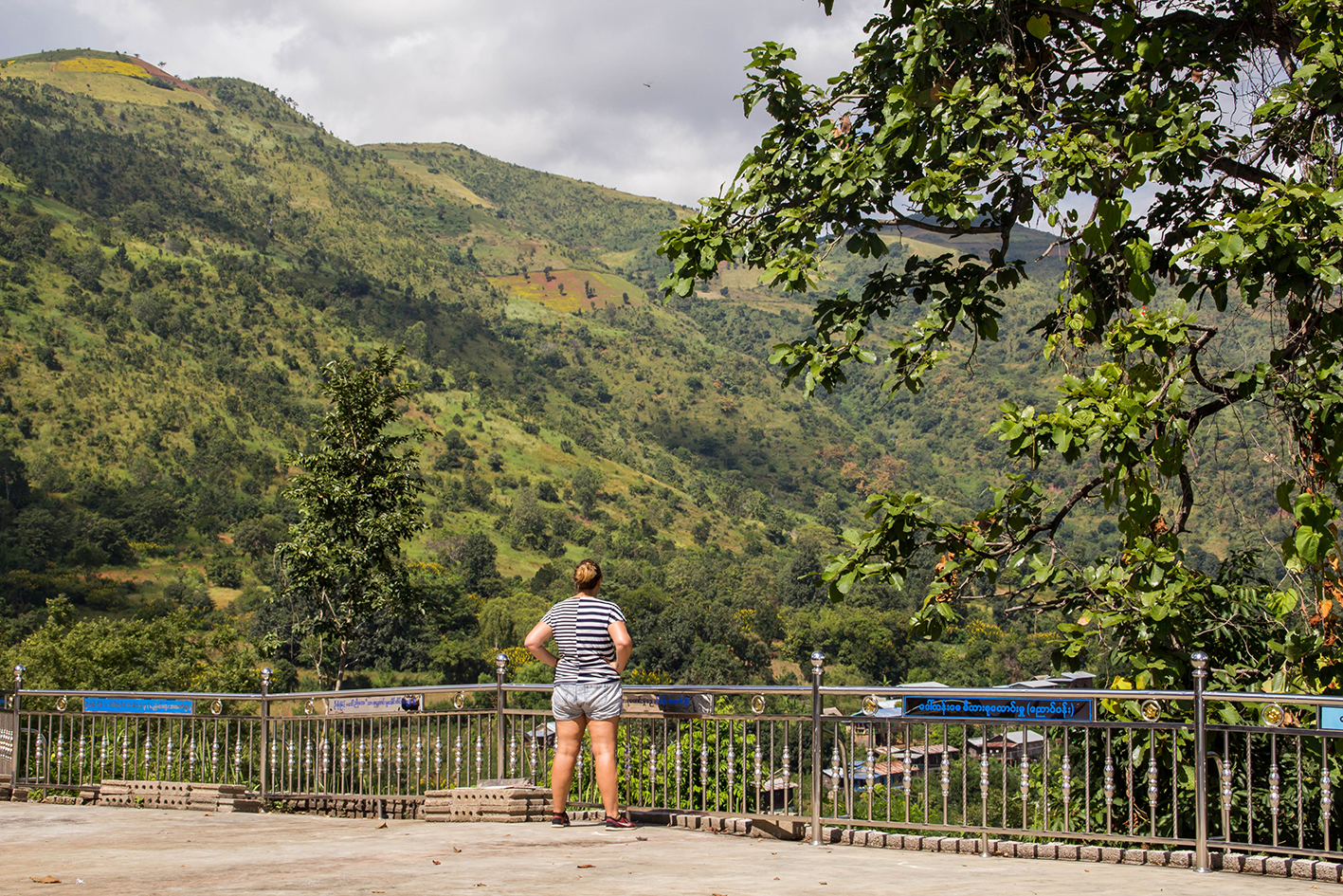 Vill du ta dig ett dopp i poolen som byggts här vid källorna kostar det cirka 10 000 Kyat (Cirka 70 kronor). Vi hoppar över det och knatar istället upp till utsiktsplatsen vid templet som ligger precis intill. Det är en lång trappa men utsikten över norra delen av Inle Lake är värd klättringen.
