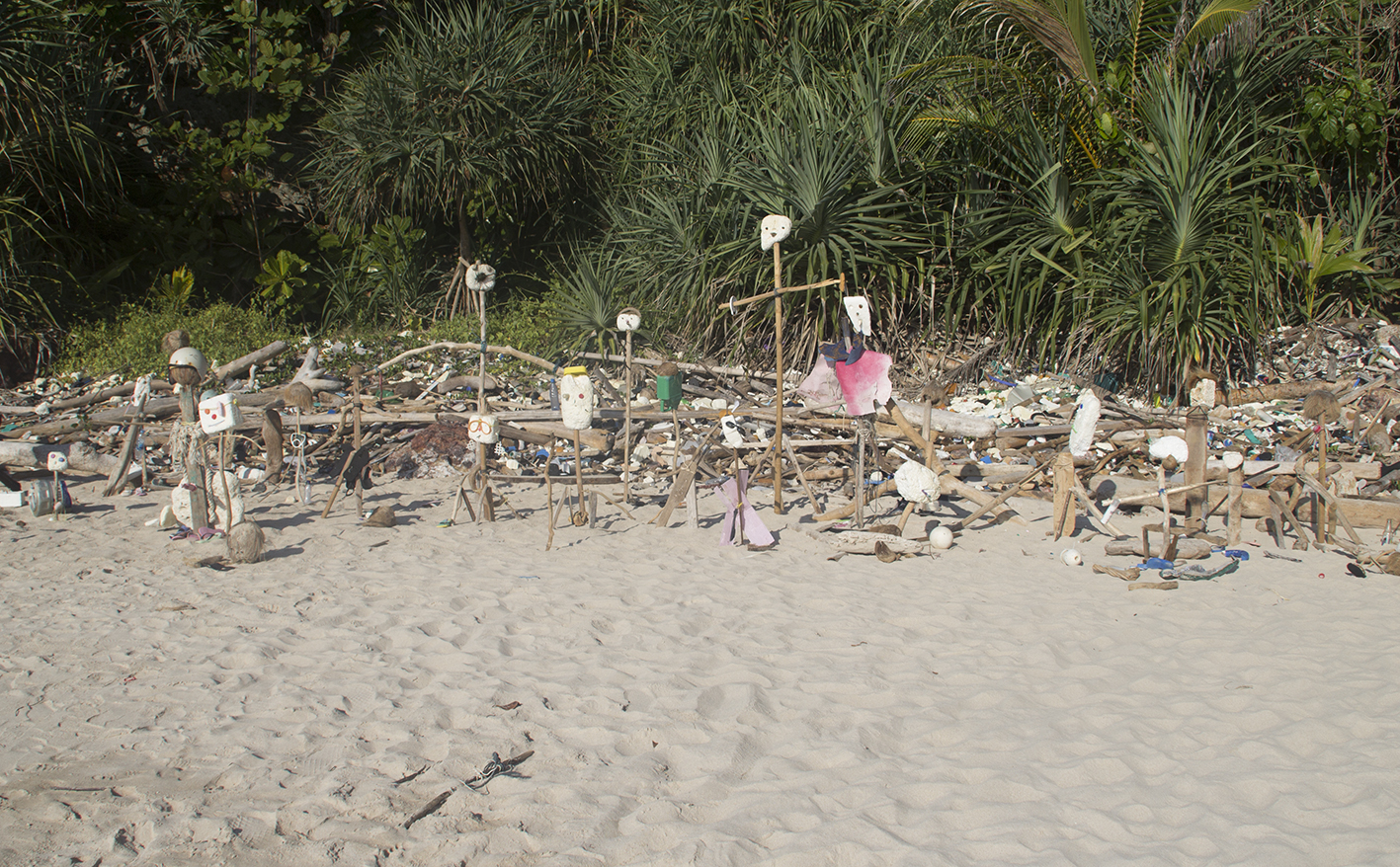 På en strand i Thailand har lokala invånare försökt se glädje i det tragiska och byggt figurer av skräpet. Foto: Patrik Enlund