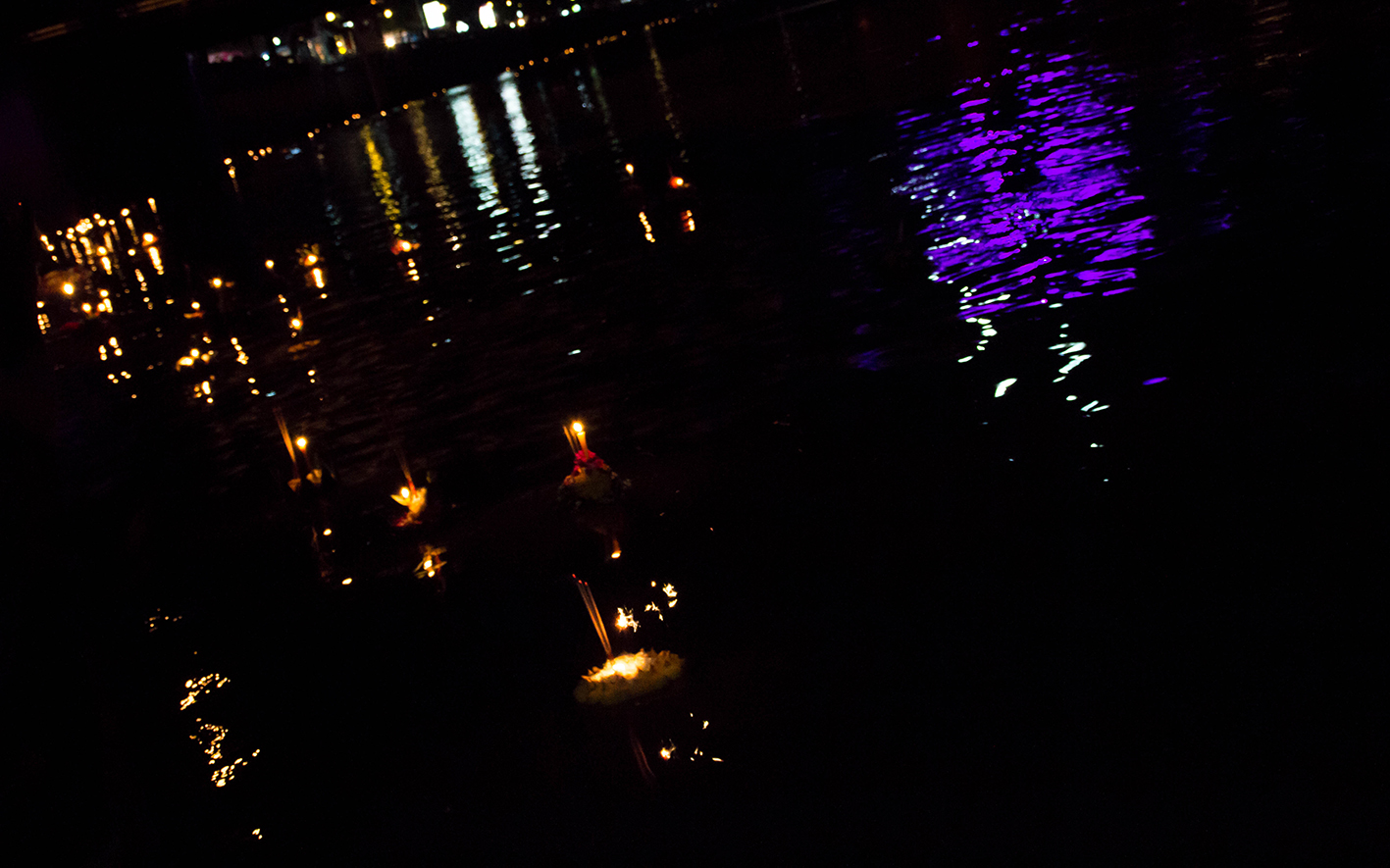 Loy Krathong betyder i princip ”släpp iväg din krathong”. En krathong är ett typ av ljus som tillverkas av thailändarna för att kunna flyta på vatten. Vackert dekorerat i bananlöv och blommor i mängder av olika färger. Dessa ljus sätts ner i floden och flyter fram. Enligt historien är de tänkta att symbolisera att de driver bort otur och olycka.