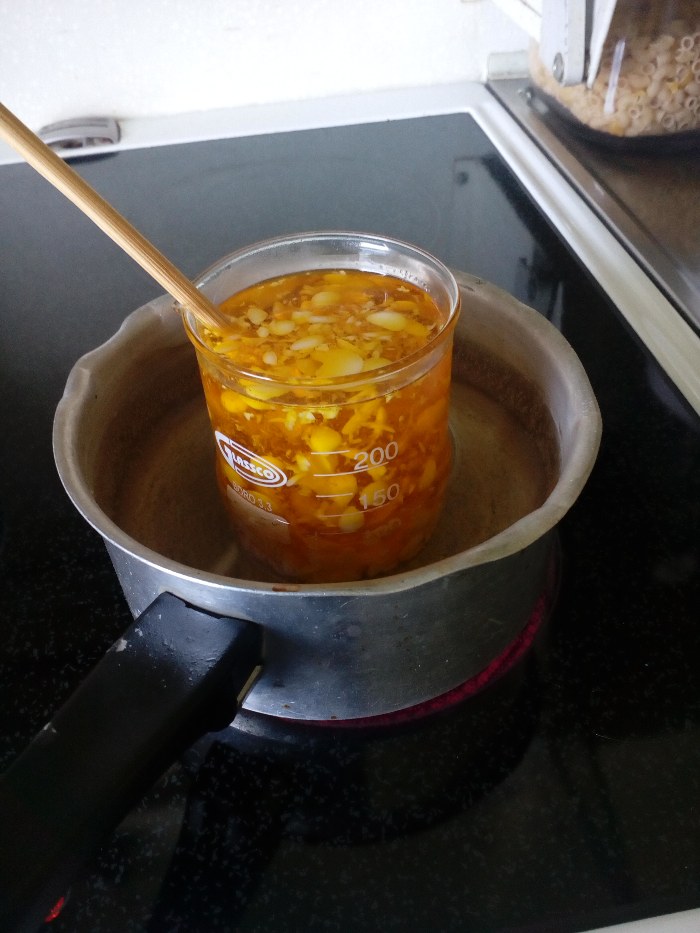 Väg upp så mycket bivax du behöver och häll sedan på din olja. Det går att göra direkt i en burk men jag brukar ha en särskild glasägare. Det är särskilt smidigt om en gör en liten större sats. Ställ bägaren i vattenbad i en kastrull (annars bränner det lätt). Nu är det bara att värma på tills vaxet smälter. Det kan se så här vackert ut. Sedan häller du upp den på burkar.