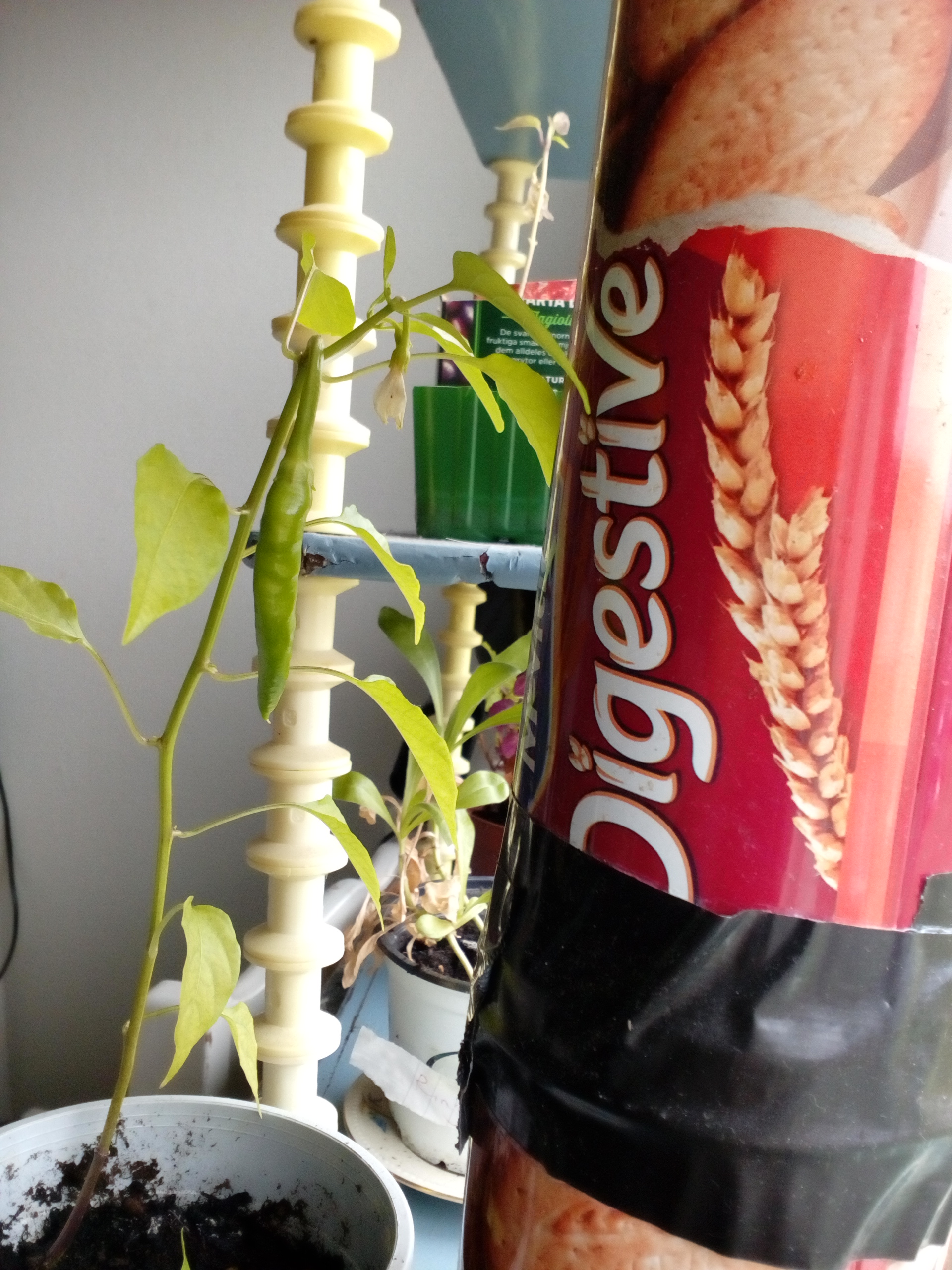 Men något kul har hänt, det har börjat titta fram en chilifrukt på fönsterbrädan. Det är min första, förra året hann chiliplantan bara börja blomma. Jag är lite stolt. Jag har redan direktimporterat lite african Birds eye-chili för plantering nästa år.