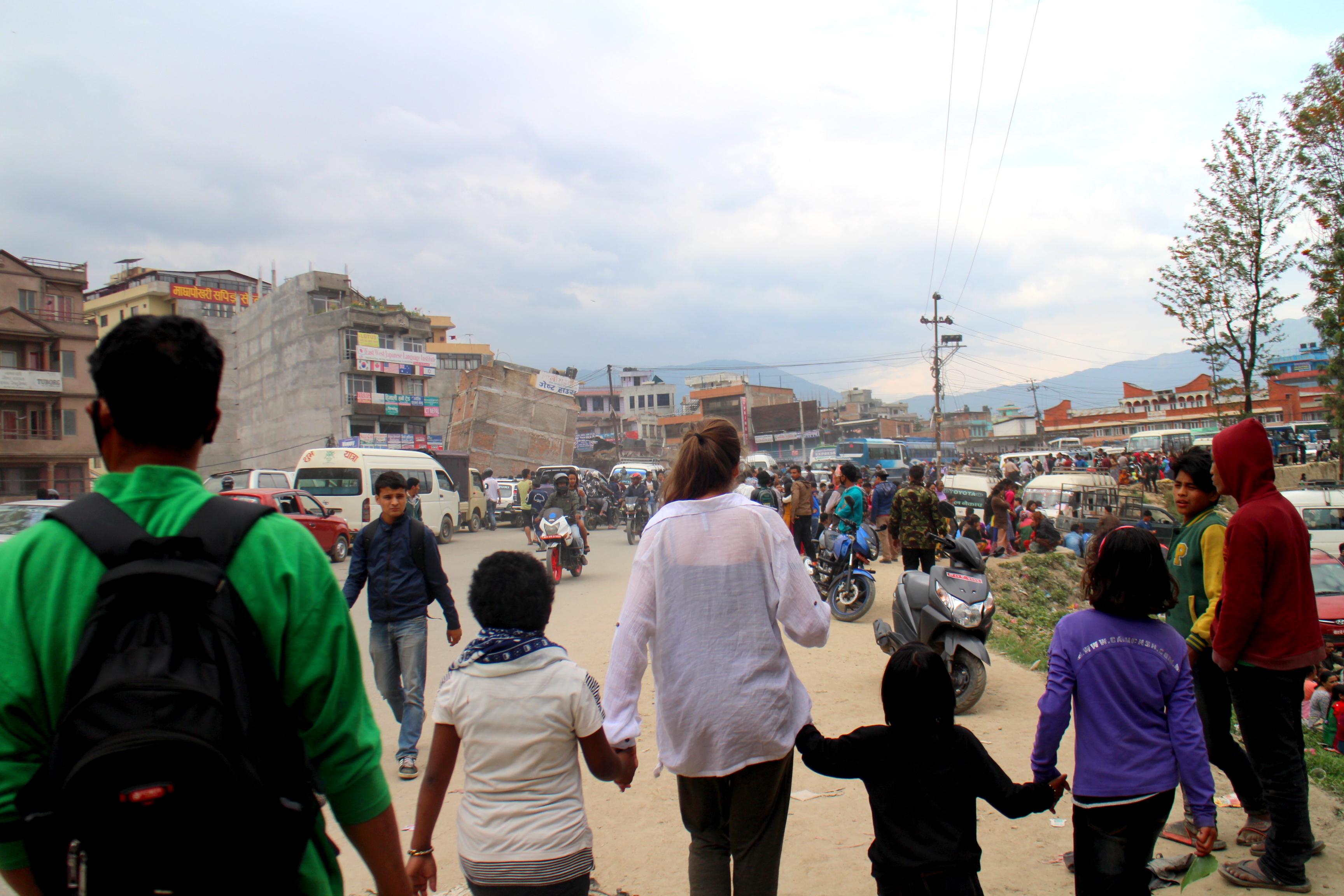 Det tog oss fyra timmar att gå tillbaka till utkanten av Katmandu, där jag bodde tillsammans med barnen och deras familj. Och vi gick snabbt! Gatorna var fulla av människor som tog sig fram till fots. Vi såg stora sprickor i vägarna, raserade hus och skadade människor. Efter att vi tagit oss fram genom ett kaosartat Katmandu kom vi hem och lyckligtvis var resten av familjen också oskadda. Vi hade väldig tur. Om vi begett oss iväg tidigare som planerat hade vi befunnit oss vid Durbar Square vid jordbävningen – ett område där många byggnader förvandlades till ruiner.