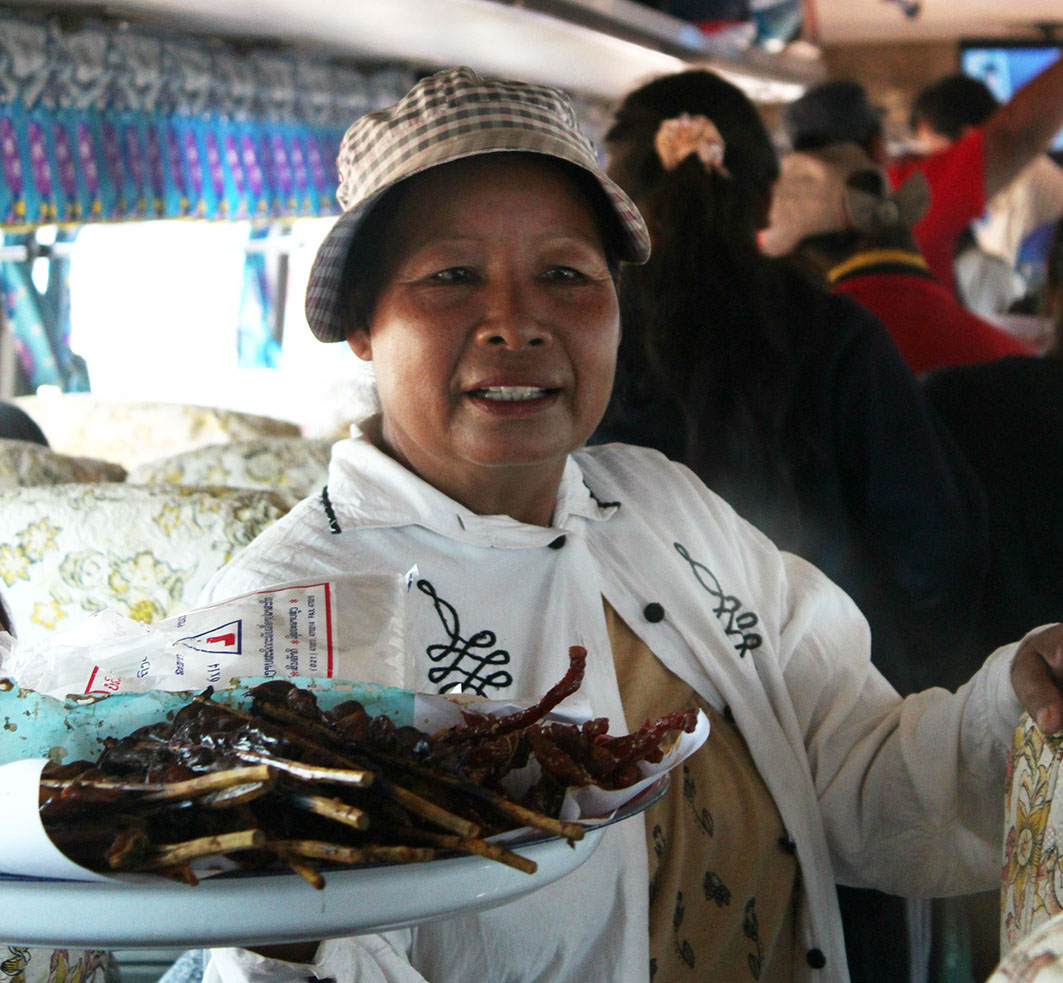 De ropar något på Laotiska som jag antar betyder att jag ska köpa av dem. Det var fläskkött och kyckling direkt från grillen. Jag känner med ens att det börjar kurra i magen och det är nu det börjar – köpslåendet. Mitt första bud får den galna hopen med kvinnor att vifta ännu mer med sin mat vilket jag tar som att mitt bud är för lågt. Då kommer en annan kvinna inuti bussen bärandes på påsar med färsk mango – vilket lockar mig.