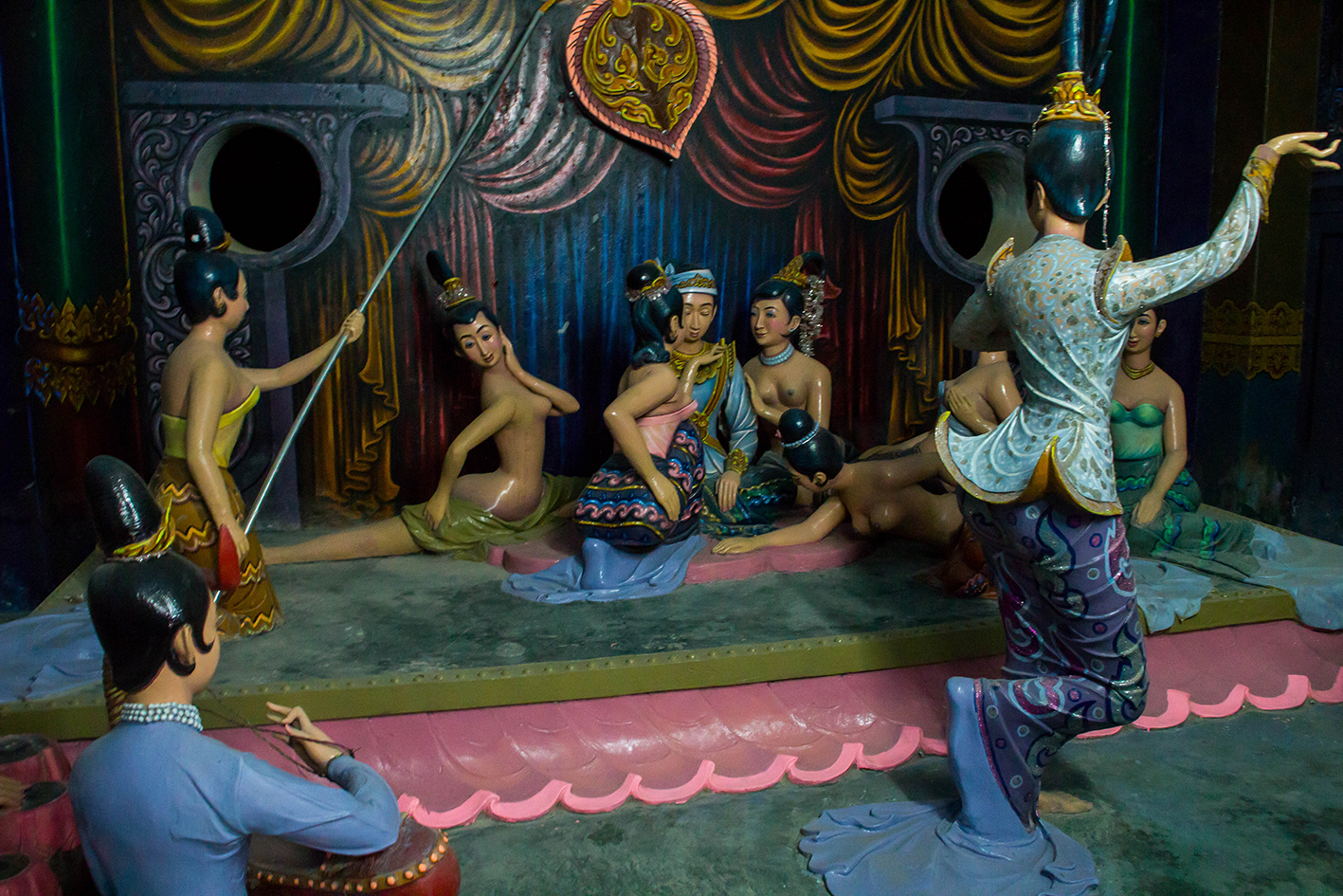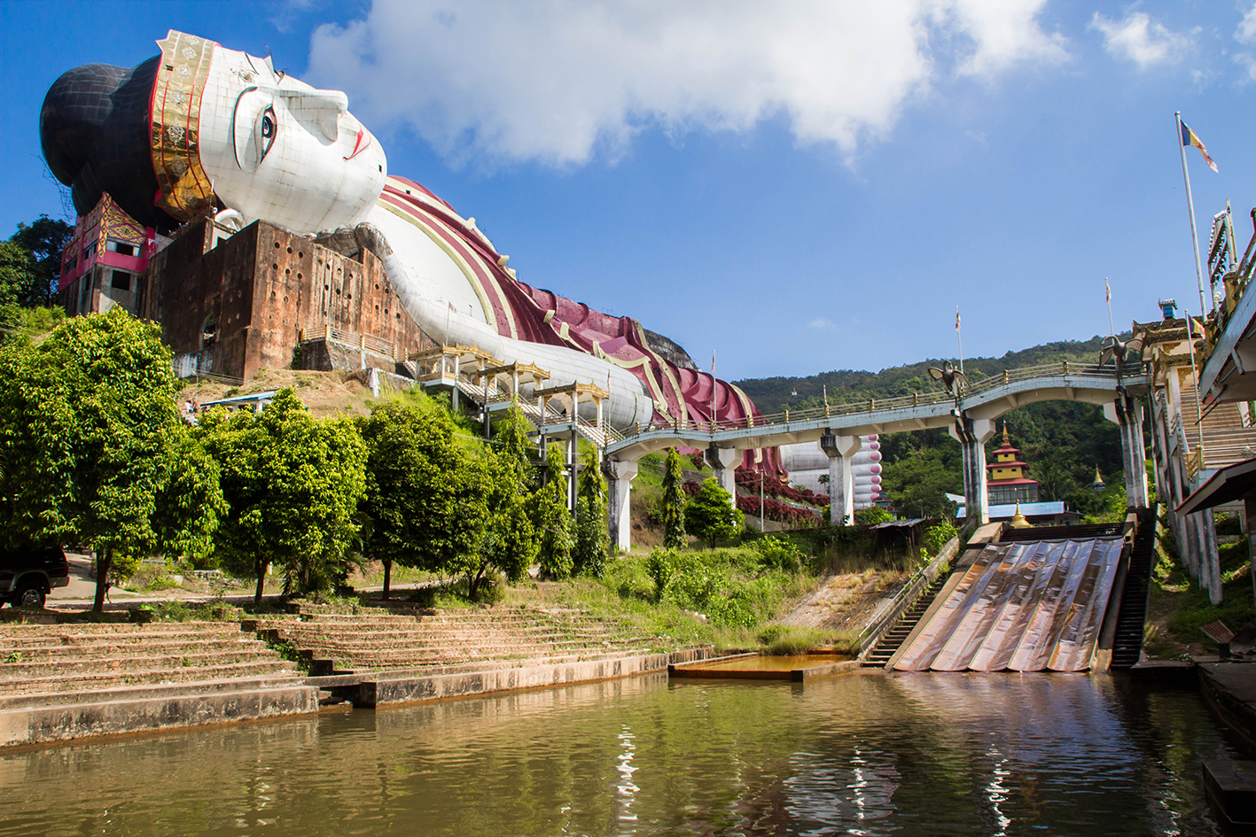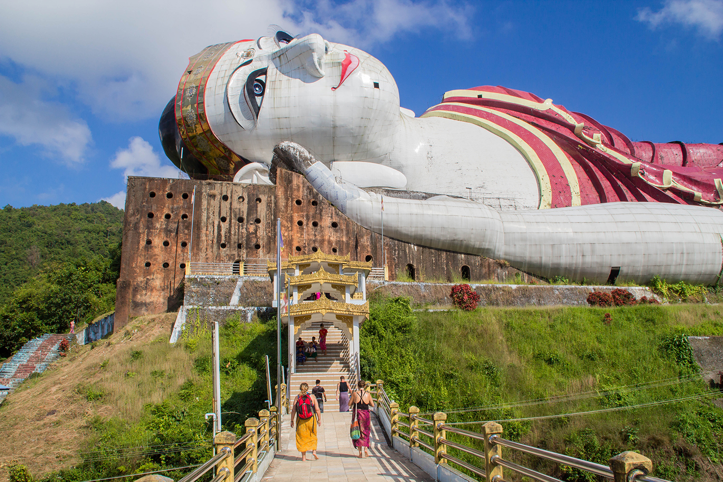 170 meter lång är denna liggande Buddha och vår chaufför Mr Nang säger att det är den största liggande Buddha i världen. Det är inga andra turister här. Bara burmeser som har kommit till denna religiösa plats. Det är möjligt att gå in i den liggande Buddha. På insidan finns tre våningar med flera rum och ställningsplatser där en historia berättas genom figurer och målningar. Magnifik detaljrikedom. Hela byggnaden och utställningsmontrarna är fortfarande under arbete. Bygget har pågått i tio år och håller alltså på än.