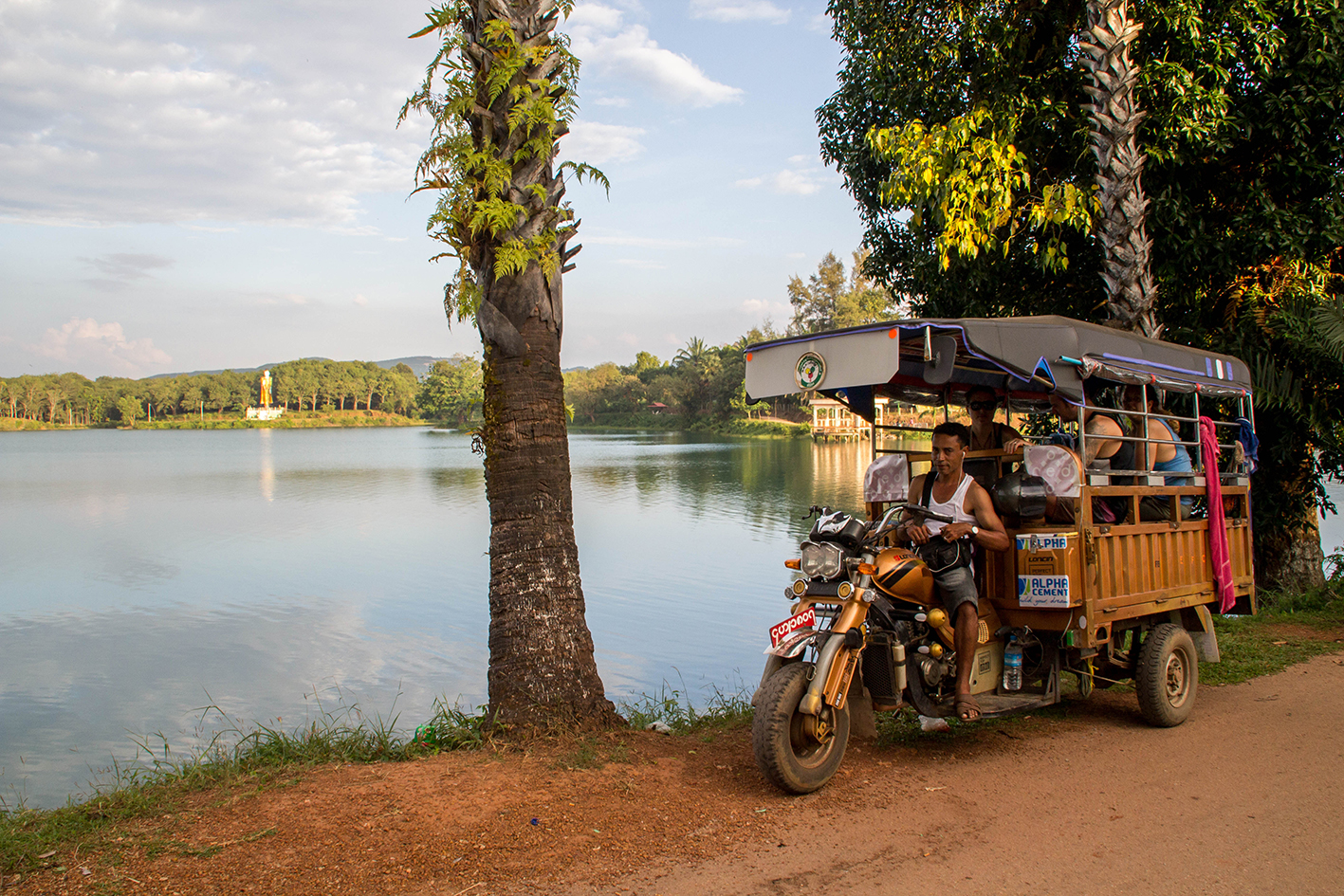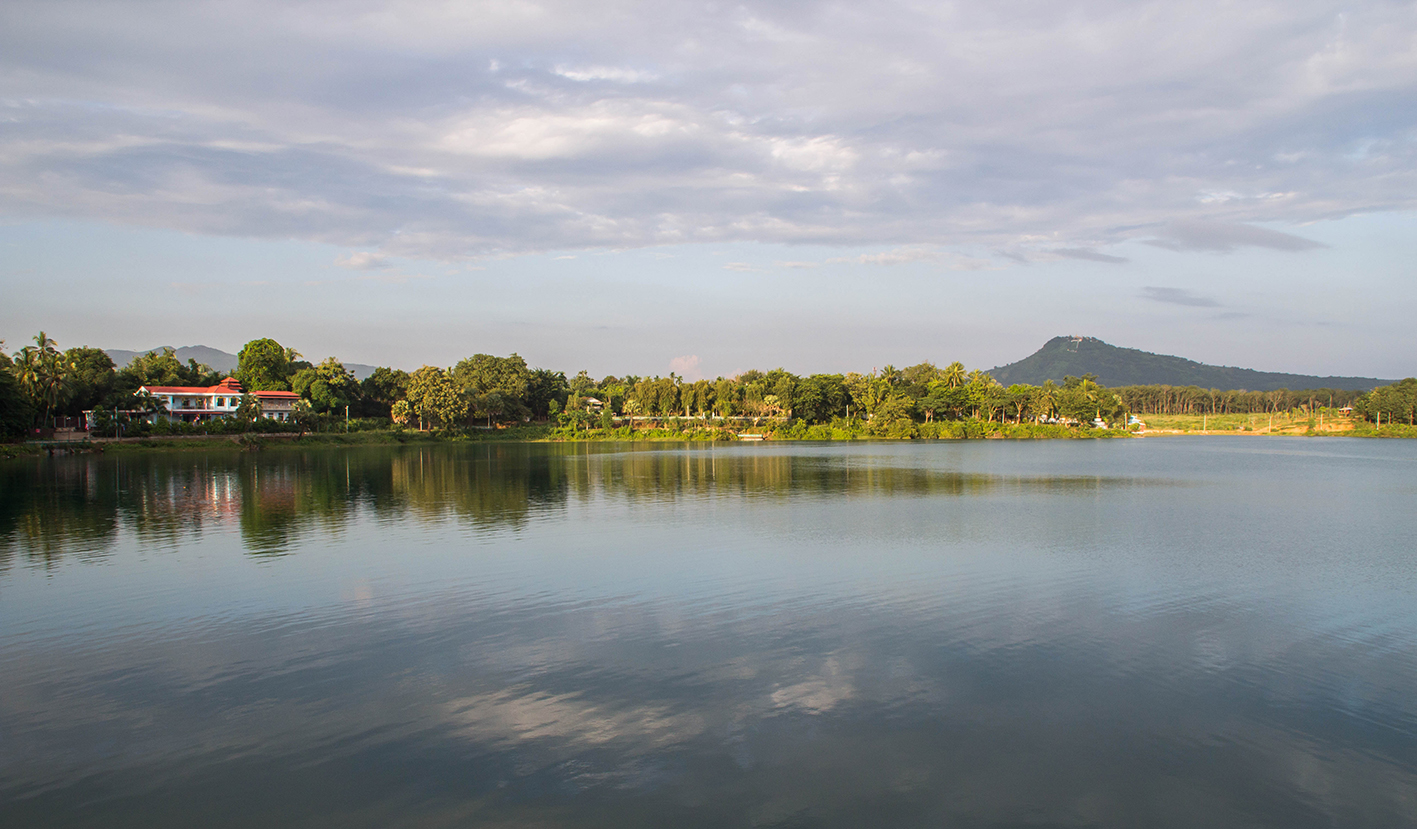 Vi kör förbi sjön och templet. Vi lägger mer fokus på sjön då vi känner oss trötta på tempel. Sjön ligger spegelblank när vi passerar. I ena viken ligger några byggnader och en barnfamilj tar sig ett svalkande kvällsdopp.
