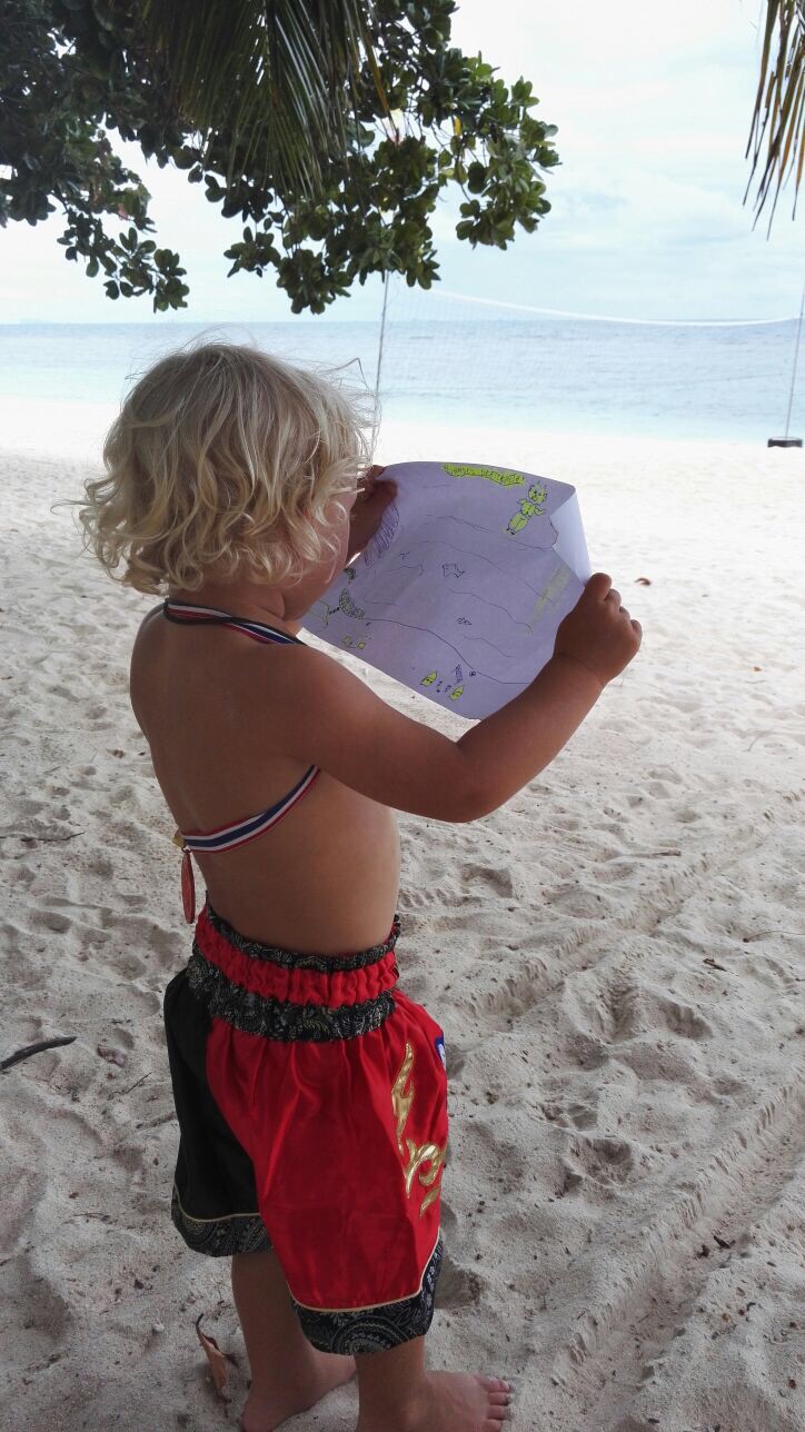 När jag skriver detta ligger jag i en hängmatta under träden med Maja sovandes på mig. Rasmus har gjort en skattkarta till Valle och de ska snart gå på skattjakt på stranden. Det är mulet, och ganska svalt. Vågor rullar in mot stranden och det är svårt att inte somna.
