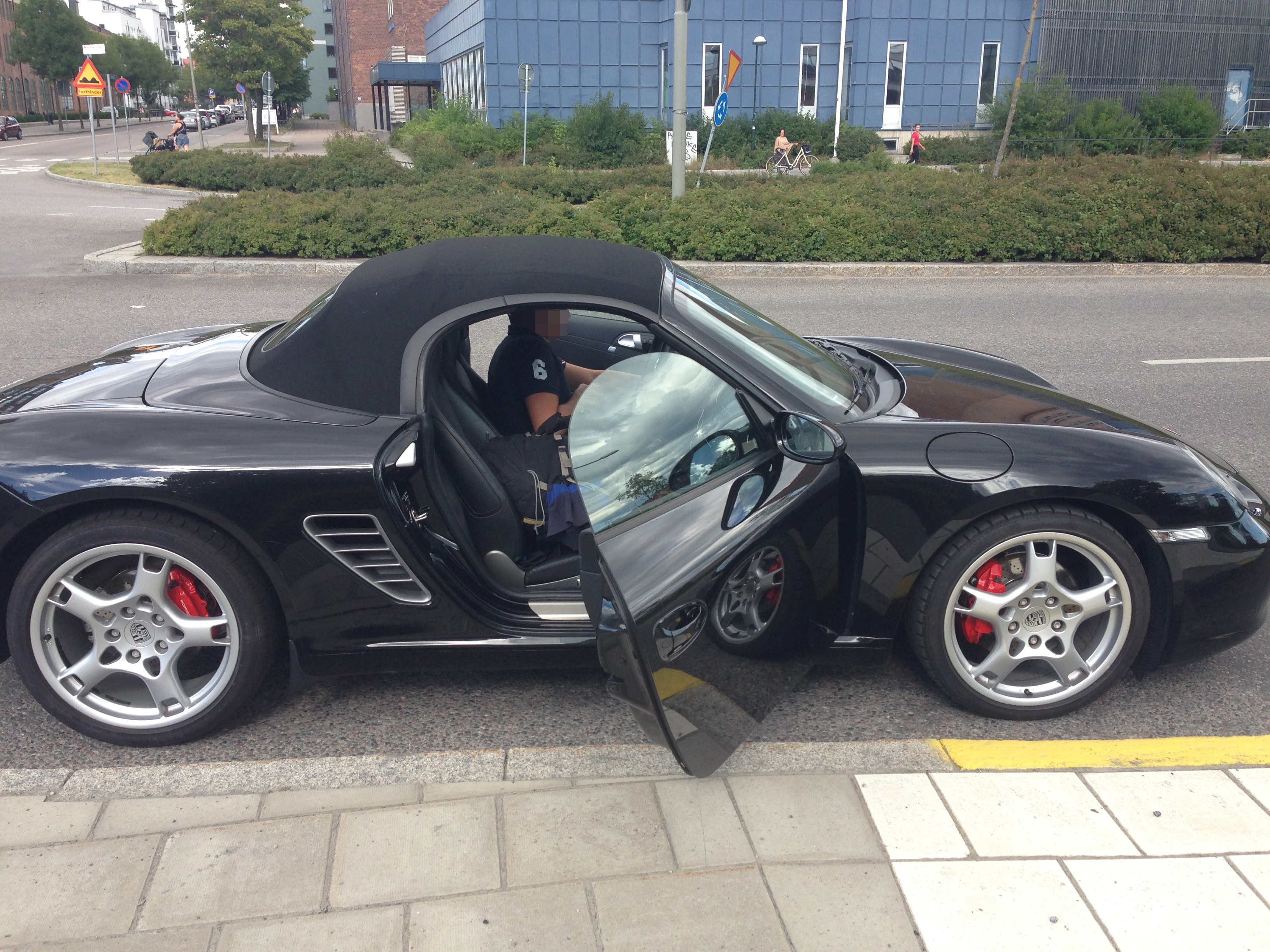Bilen visar sig vara en Porsche Boxtser. Personligt kan jag väldigt lite om bilar men får lära mig att motorn sitter bak.