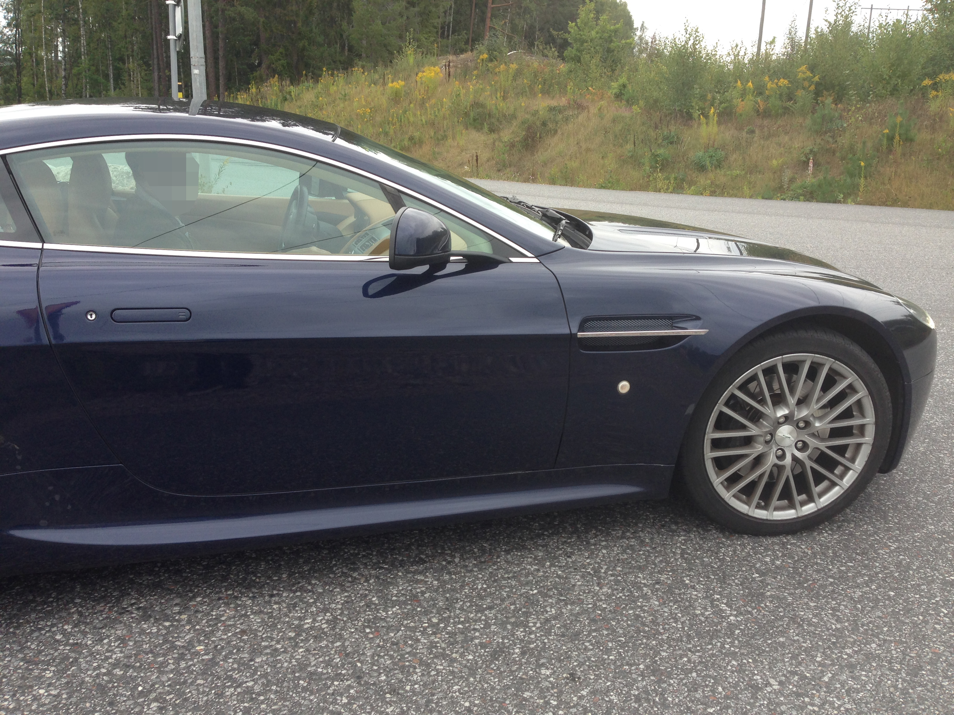 Då stannar en mörkblå sportbil som jag som ni förstår inte kan placera. När jag hoppar in i den tvåsitsiga bilen berättar föraren att det är en Aston Martin.