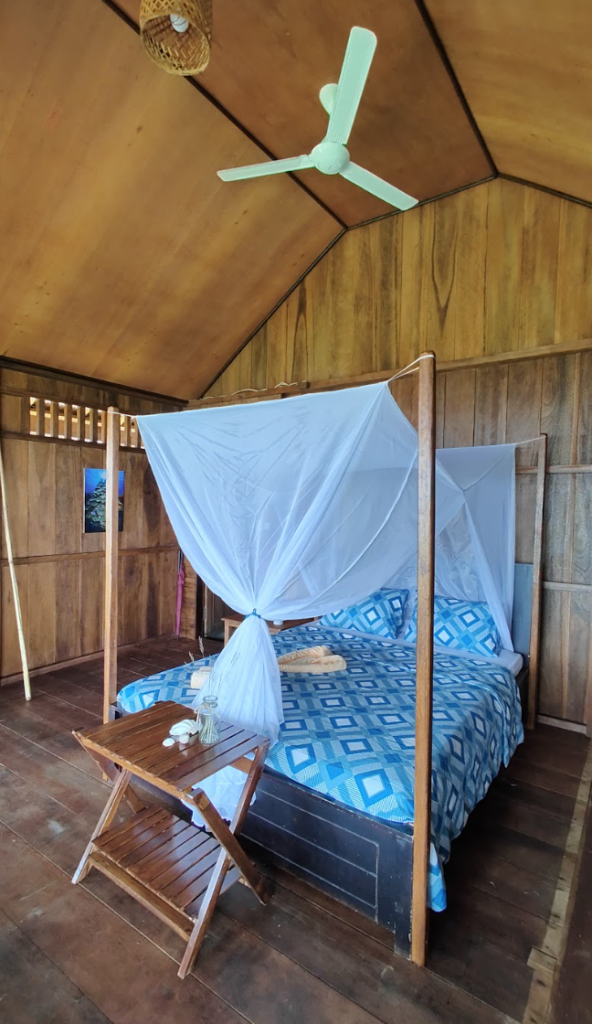 Såhär ser det ut inne i våra bungalows som har plats för 2 eller 3 personer och där det finns air condition, samt en fläkt – som du ser på bilden.